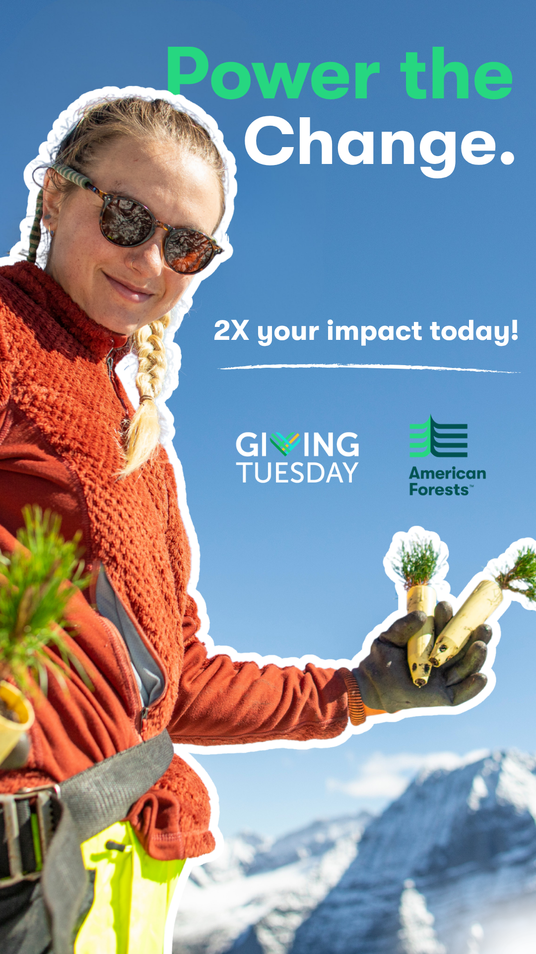 In order to rein in a broader audience, I highlighted content that spoke to the majority of environmentalists. As for the visual strategy, I utilized a minimalist approach that aligns with the American Forests brand while emphasizing only the most essential information, compelling viewers to learn more. My creative process for the Giving Tuesday assets was similar. I chose approachable imagery and messaging that depict real environmental action, demonstrating to potential donors that their contributions to American Forests will make a meaningful impact.